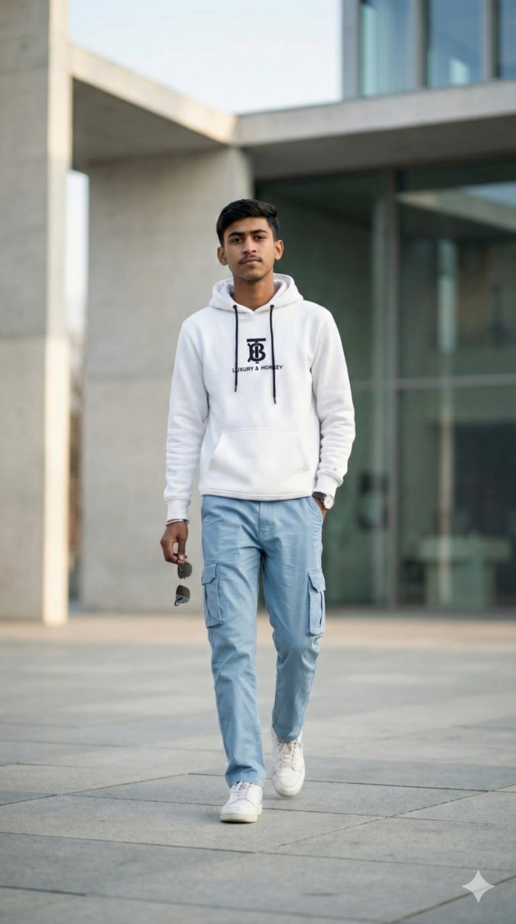 Copy This Prompt: “Ultra-realistic modern fashion portrait of a confident young man walking mid-stride in a clean, contemporary architectural setting. Full-body shot, calm expression. White luxury hoodie with black logo and drawstrings, light blue cargo pants, white sneakers, watch, sunglasses in hand. Face identical to reference, Same Hairstyle. Natural daylight, cinematic lighting, shallow depth of field, high-end fashion editorial, social-media ready. The man has the same face, hairstyle. Aspect Ratio: STRICTLY 9:16”