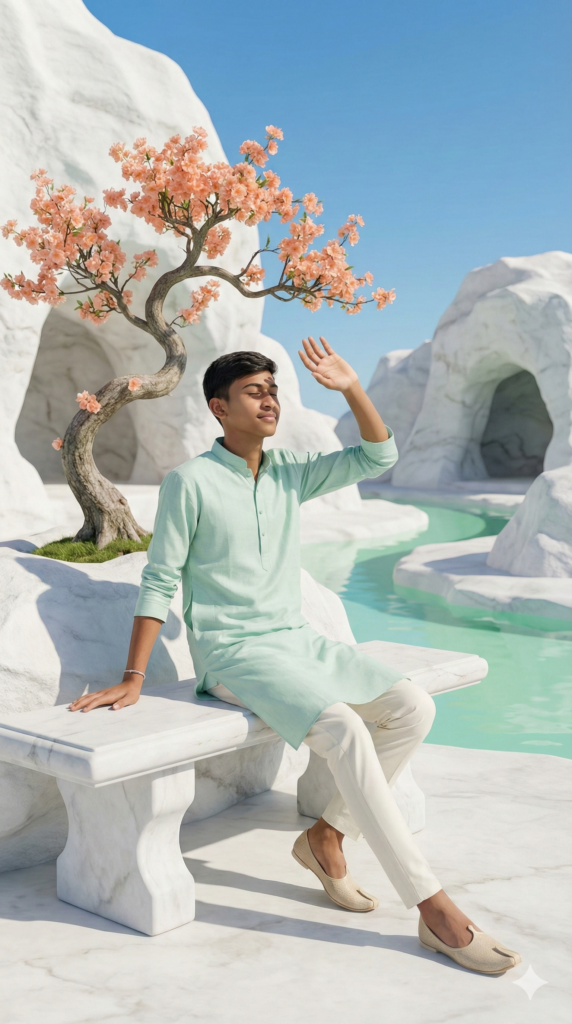 Copy This Prompt: “Ultra-realistic surreal full-body portrait of a young boy, STRICT IDENTITY LOCK ENABLED. Use the uploaded image as an EXACT facial reference. Pose & Expression: The boy is seated sideways on a white sculpted stone bench, one hand resting naturally on the bench, the other hand gently raised near the forehead as if shielding sunlight. Legs relaxed, slightly crossed at the ankle. Outfit: Modern pastel outfit — mint-green or sky-blue kurta-style long shirt paired with slim-fit off-white trousers. Environment & Background: A surreal fantasy landscape of pure white chalk-like rock formations, smooth sculpted textures resembling marble or salt caves. A single artistic bonsai-style tree beside the bench, curved trunk, delicate branches, peach-pink blossoms. Sky: Clear vivid blue sky, soft gradient. Mood: Peaceful, dreamy, elegant. Aspect Ratio: STRICTLY 9:16”