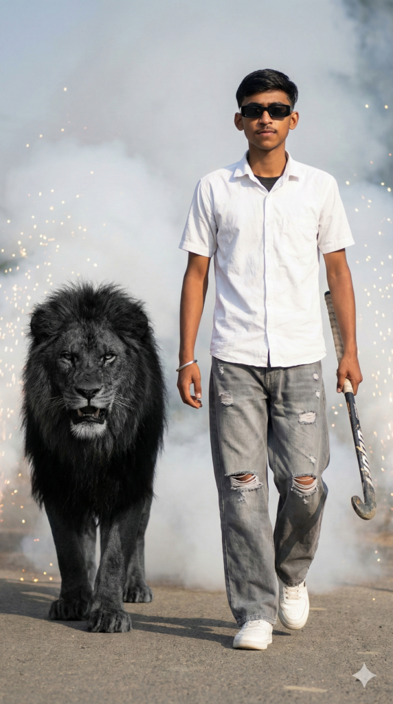 Copy This Prompt: “Realistic DSLR photo of a stylish young boy Fair skin from reference photo walking out from thick white smoke, Wearing white sleeve Shirt gray ripped Baggy pants white one hockey stick in one hand, sneakers, and rectangular black model sunglasses Attitude action mode, confident walk, sparks and smoke around, cinematic Sharp natural skin texture, real shadows, no plastic look. 4:5 | Natural daylight | smoke entry 8K ultra realistic. Wear bracelet and A black black and angry lion walking beside”