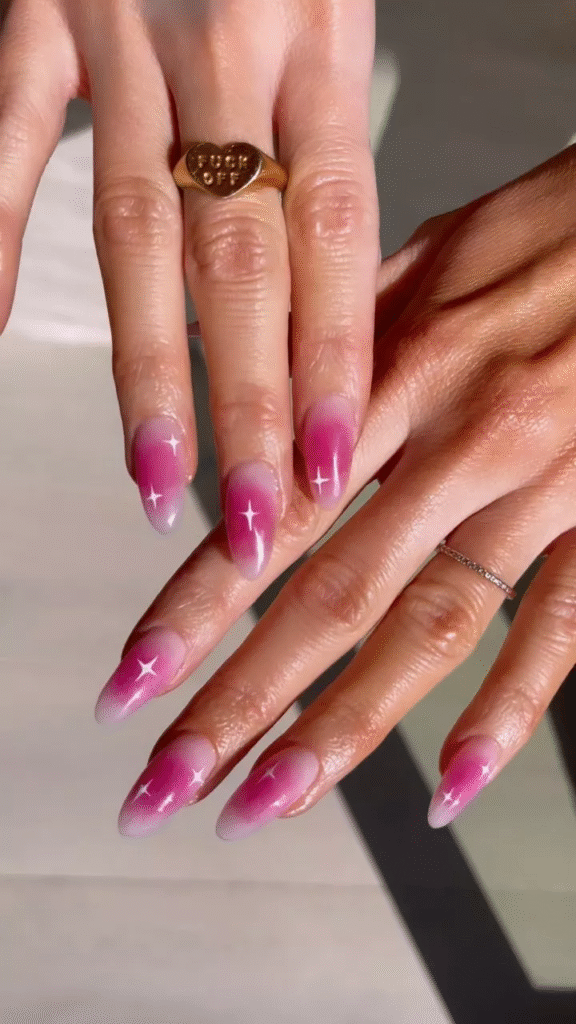 Try a bright pink shade at the center of your nails and let it fade softly toward the sides. This gives a pop of color that’s noticeable yet classy. It’s great for when you want a playful, bold look.