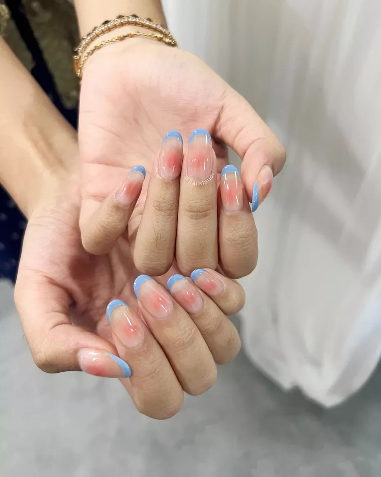 Add a fun twist by pairing your blush nails with colored French tips. Try soft blue or lilac tips for something different and modern.