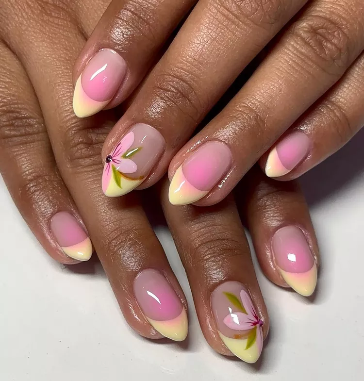 This style mixes French tips, floral accents, and a blush overlay. It’s creative and elegant—ideal for weddings or special occasions.