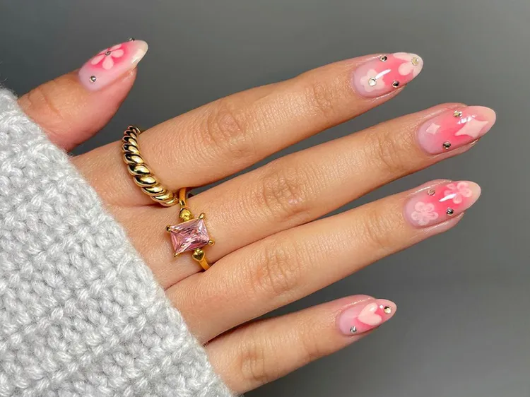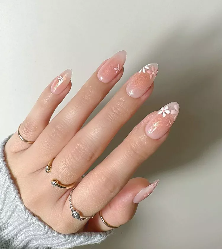 Go bold with daisy stickers or tiny gemstones on top of your blush nails. It’s playful, sparkly, and super cute for spring or summer.