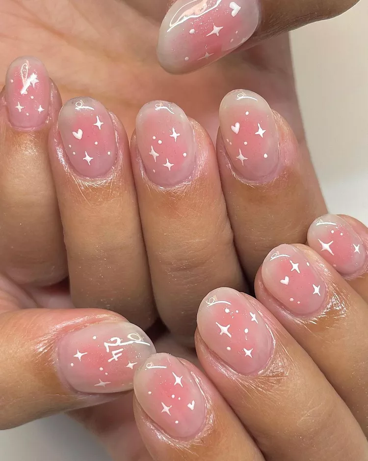 Want something more fun? Add tiny white stars or heart designs over your blush nails. It gives them a cute, dreamy vibe that looks great on short or long nails.