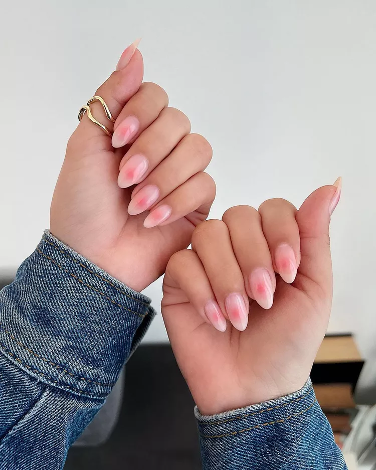 Blush nails are inspired by aura nails, but they look lighter and softer. The main idea is to create a diffused pink color in the center of the nail, which slowly fades out toward the edges. You can use shades like pink, peach, or mauve—basically the same colors you’d use for your cheek blush.