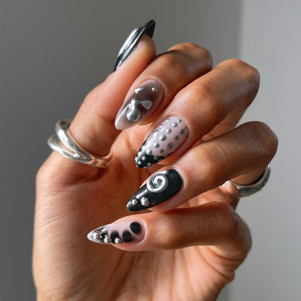 For a more avant-garde design, combine shimmery silver nails with abstract black details. This combination creates an edgy yet sophisticated look that’s perfect for anyone who loves creative nail art.