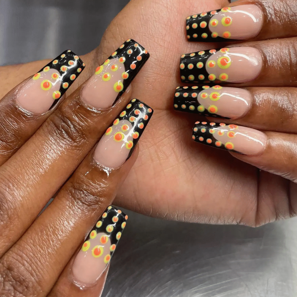 Take your black French manicure to the next level with neon polka dots. The black tips serve as the perfect backdrop for the vibrant, playful dots, making your nails stand out.
