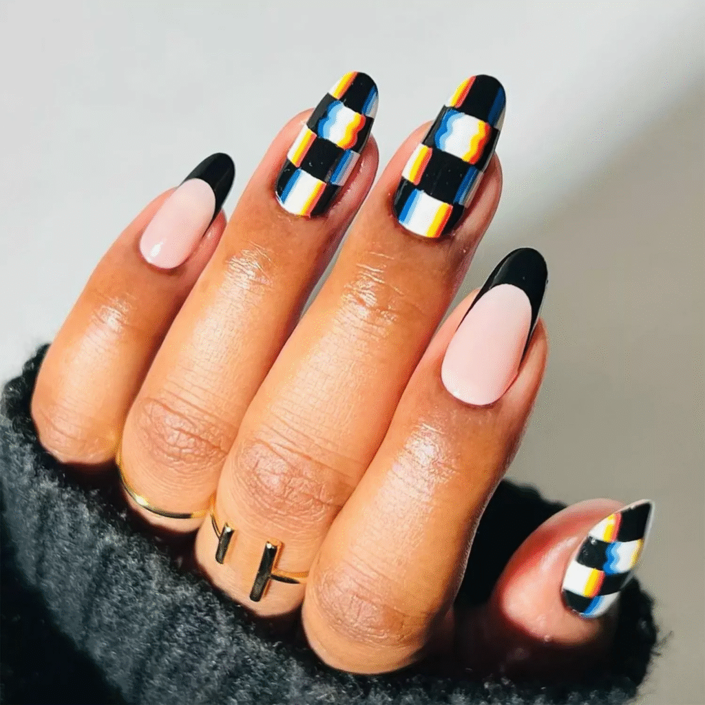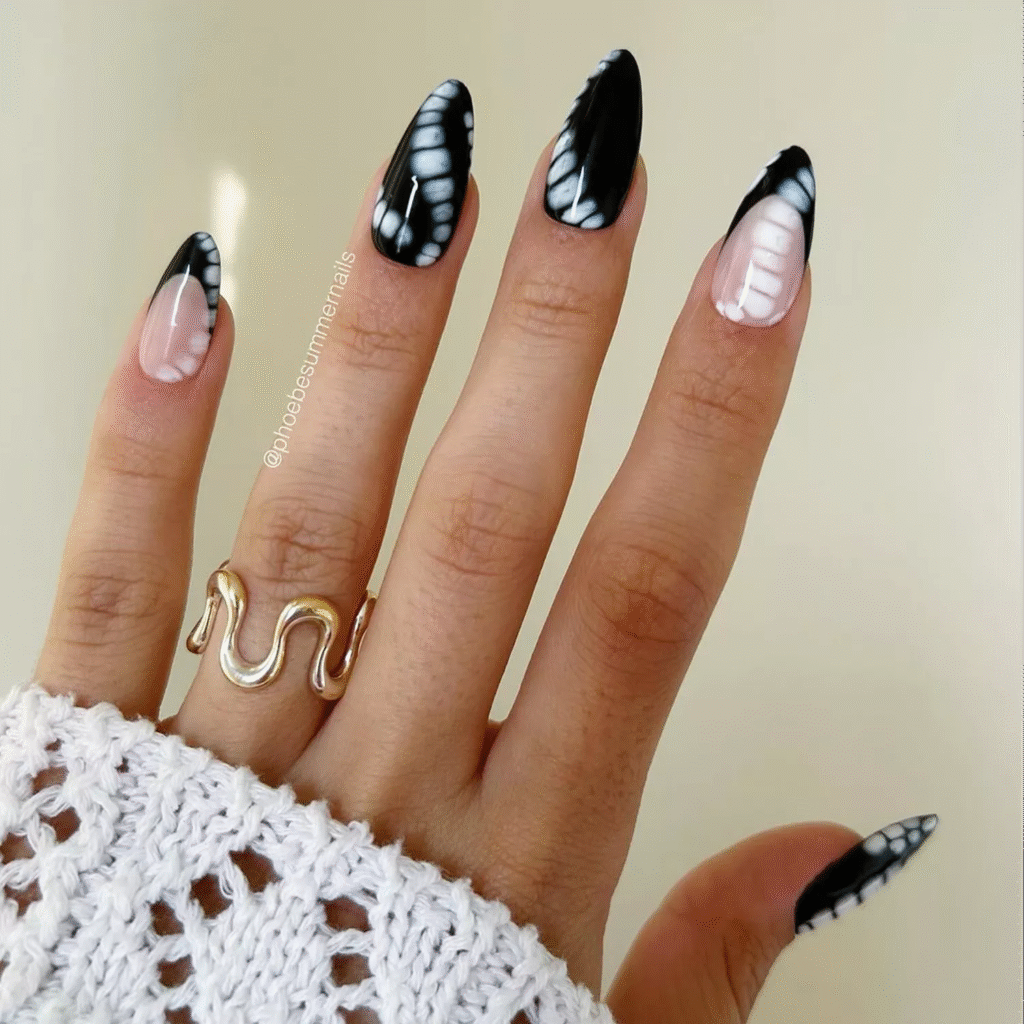 Give your black French manicure a fun twist with a black-and-white tie-dye design. The bold colors and funky style make this look perfect for those who want to try something new.