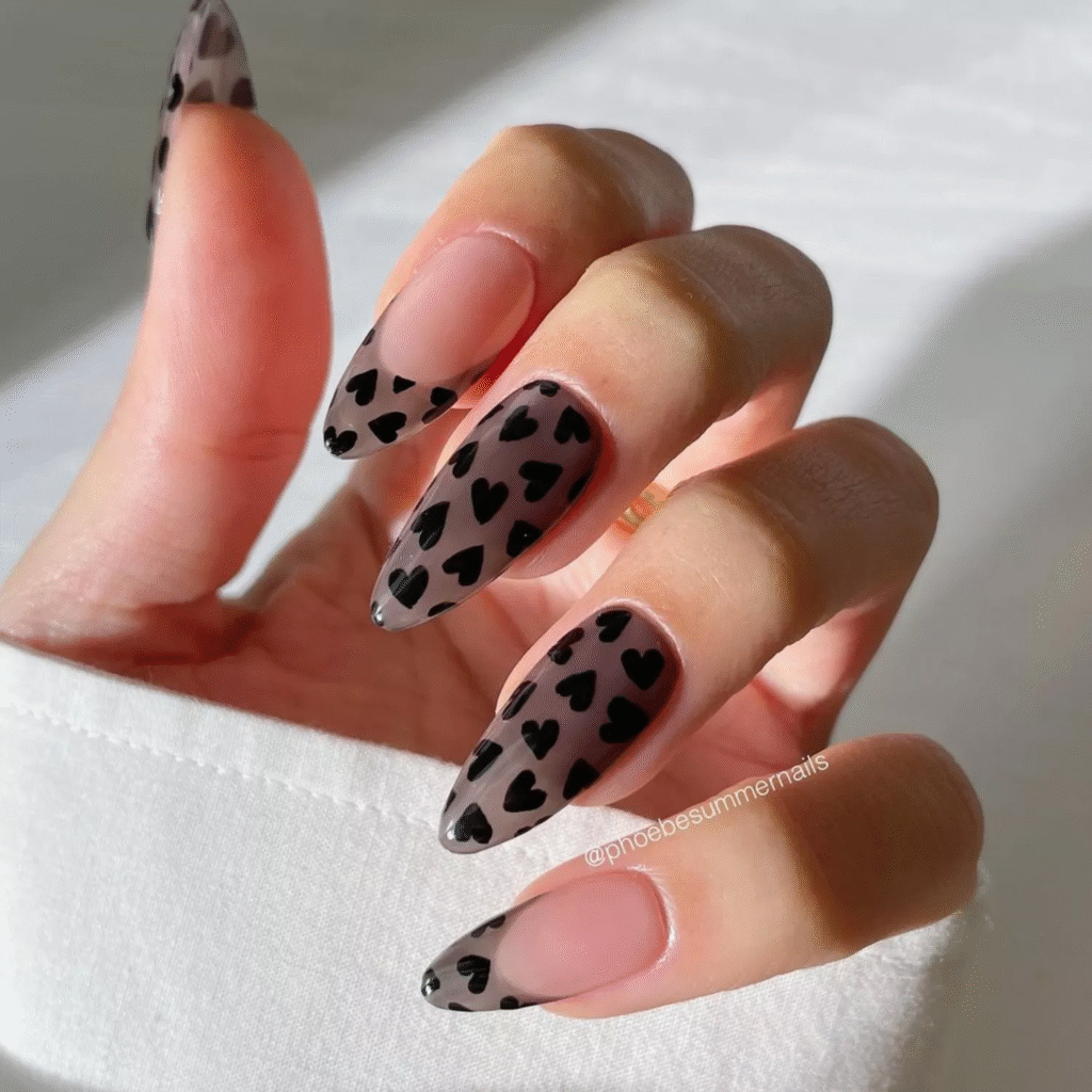 Black jelly nails with French tips and heart designs make for a romantic and trendy look. The sheer jelly finish adds a soft touch to the bold black tips, while the tiny hearts make it even more fun.