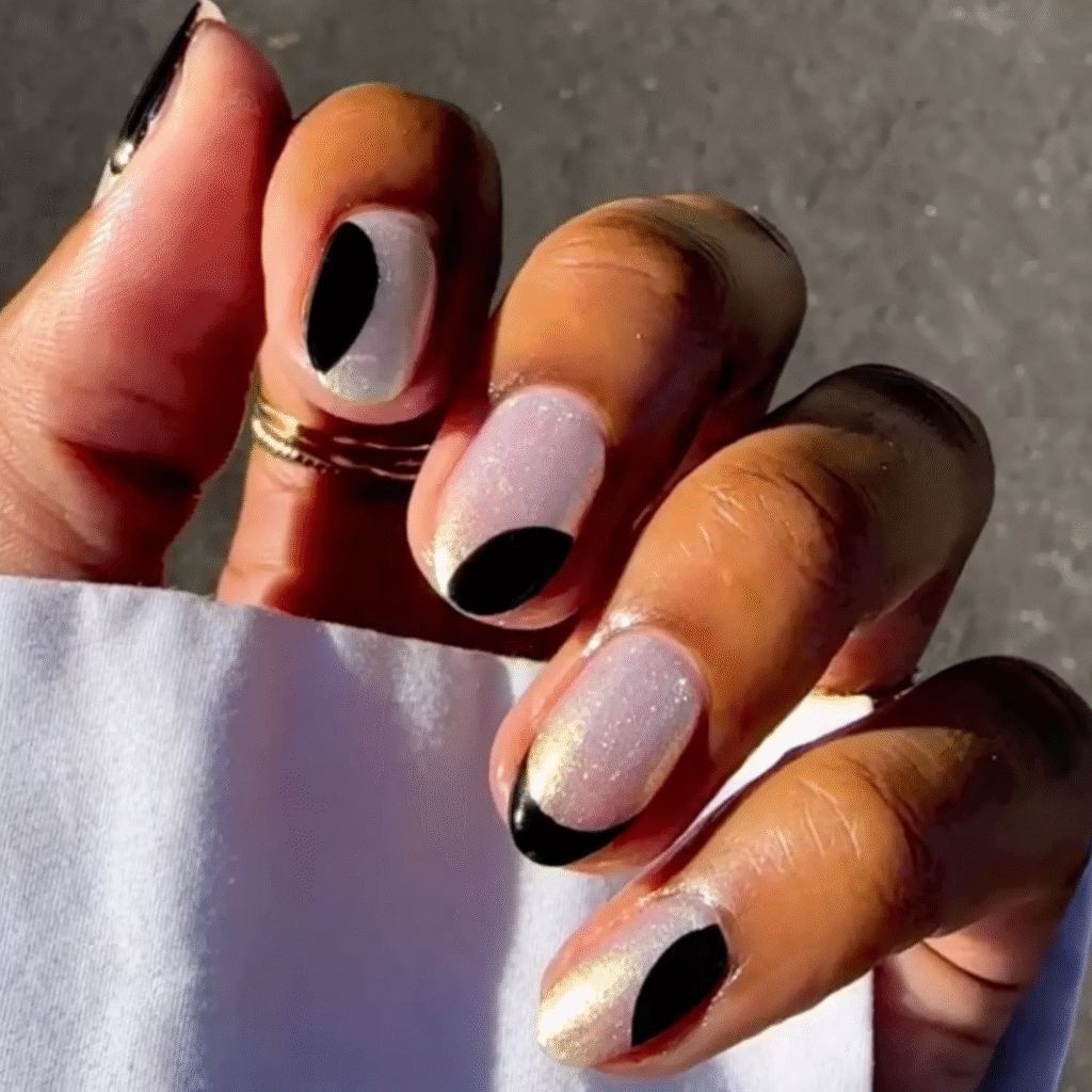 Mix black matte French tips with a touch of gold streaks for a chic, textured look. This style combines different finishes and elements to create a bold yet elegant manicure.