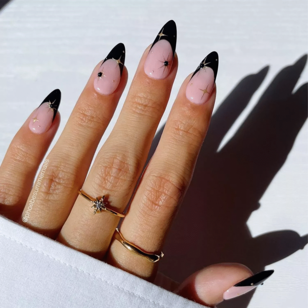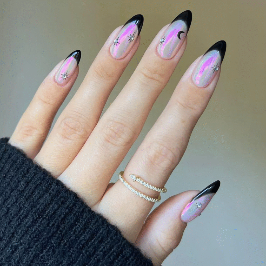 Pair your black French tips with a chrome finish and celestial designs like stars and moons. This look feels out-of-this-world and perfect for those who love a bit of magic in their style.