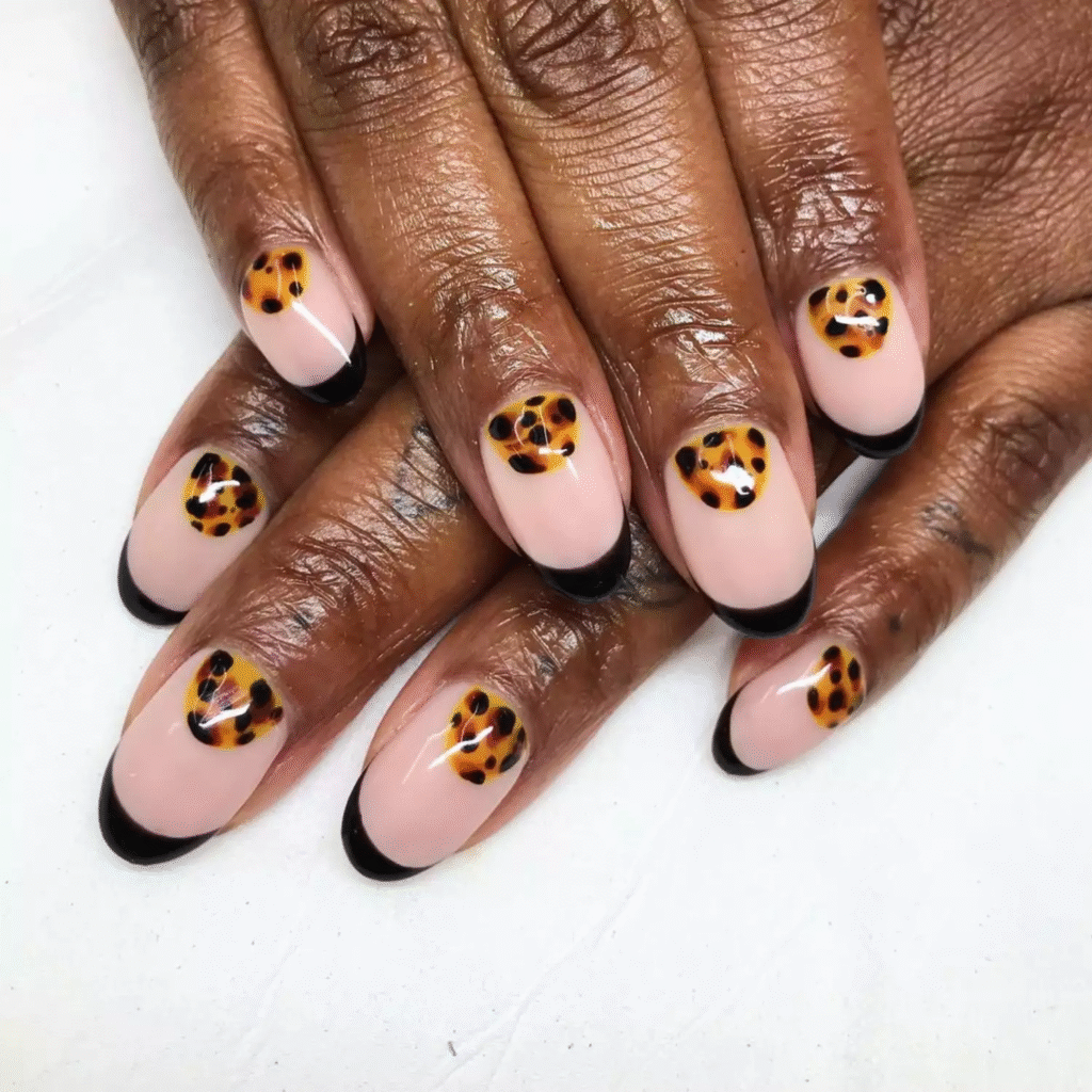 A tortoiseshell design can add a chic touch to your black French manicure. This look is creative, stylish, and adds a touch of personality to your nails.