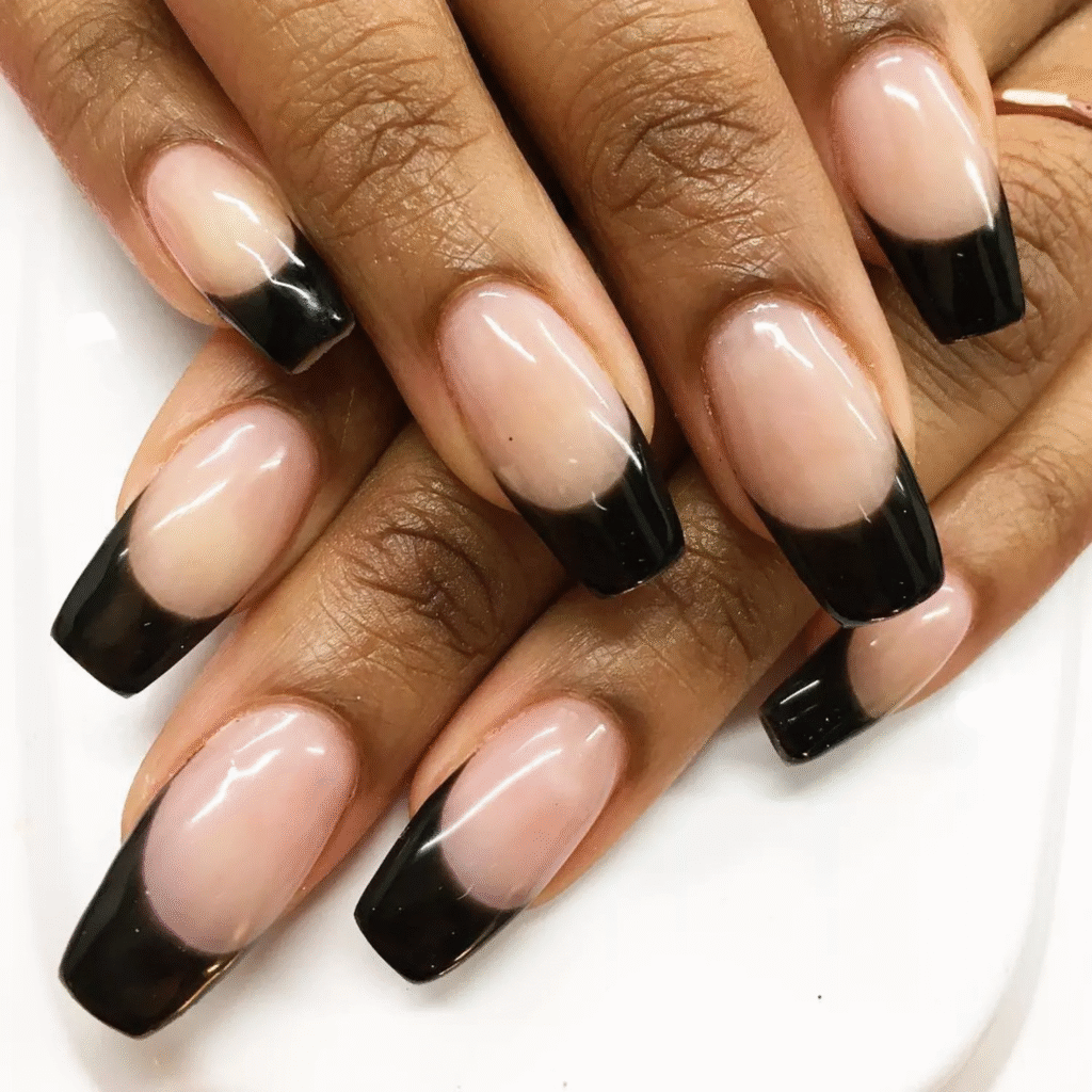 If you prefer a minimalist style, a classic black French manicure is a perfect choice. This look is simple yet chic, and it works well with any outfit. The combination of nude and black is neutral and always in style.