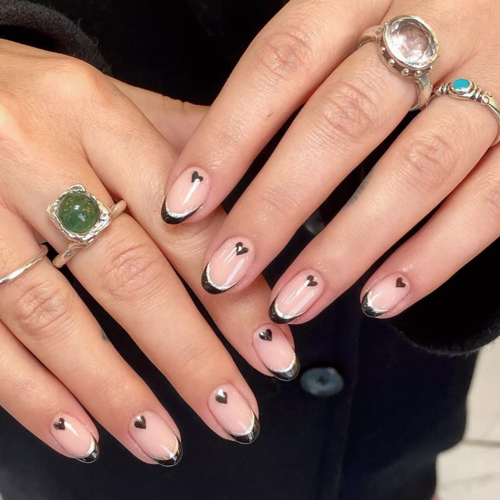 For a cute and romantic touch, try a double French manicure with black and silver tips and tiny heart details along the cuticle. This design is sweet, stylish, and adds a bit of sparkle to your nails.