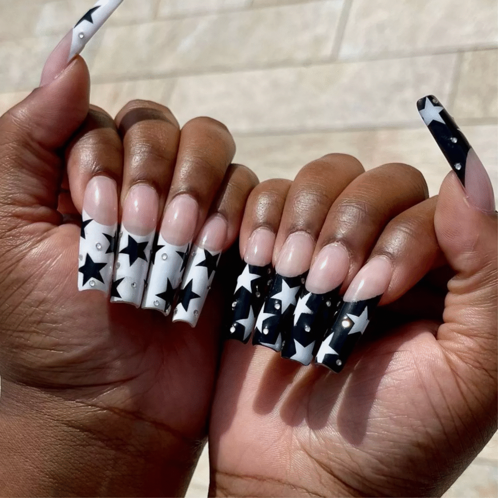 Starry designs are timeless. For extra-long nails, go for oversized stars to fill your nails. The combination of black French tips and twinkling star details makes your nails sparkle and shine.