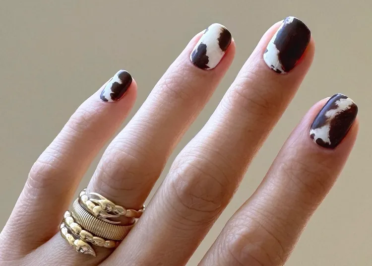 Animal prints are trendy, and this cowhide print in brown tones screams fall! It’s a unique look that doesn’t require long nails to stand out.