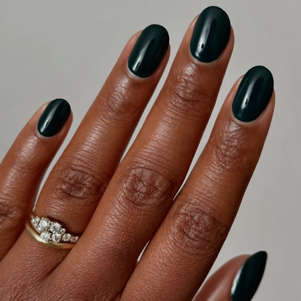 Emerald green is a gorgeous fall color, representing the deep shades of nature. A short, rounded nail with this color makes for an elegant and simple design.