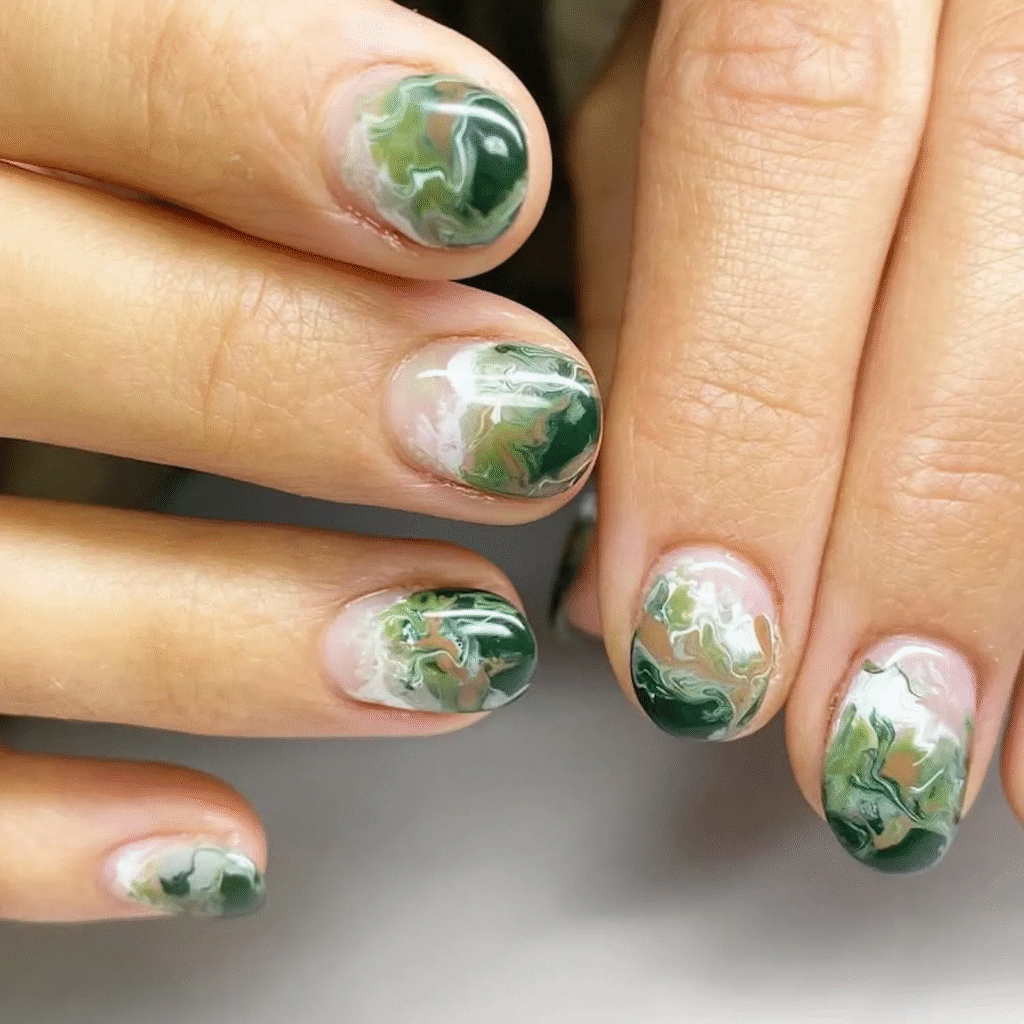 A hunter green marble design brings the forest to your nails. Add white, earthy green, and brown for a look that is as fall as it gets.