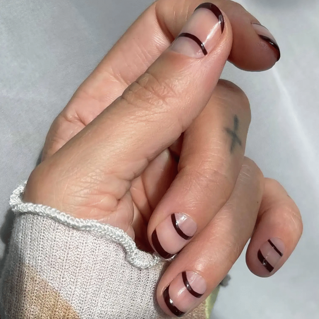 Give the classic French manicure a modern twist by adding double lines. A thinner line at the base with a thicker tip gives a clean and minimalist look that’s perfect for short nails.