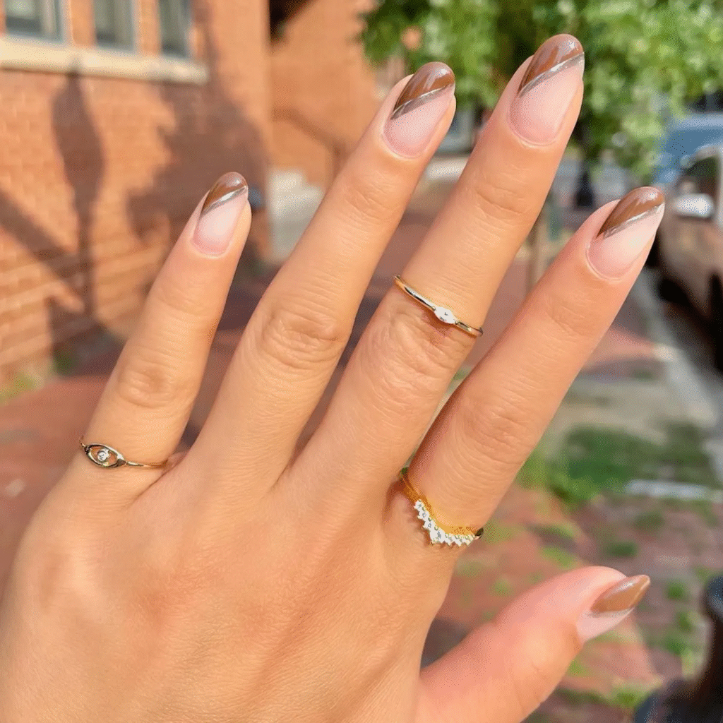 These milk chocolate-dipped nails are a sweet fall treat! Add a silver line diagonally across each nail to make the look even more stylish. This design is subtle yet chic.
