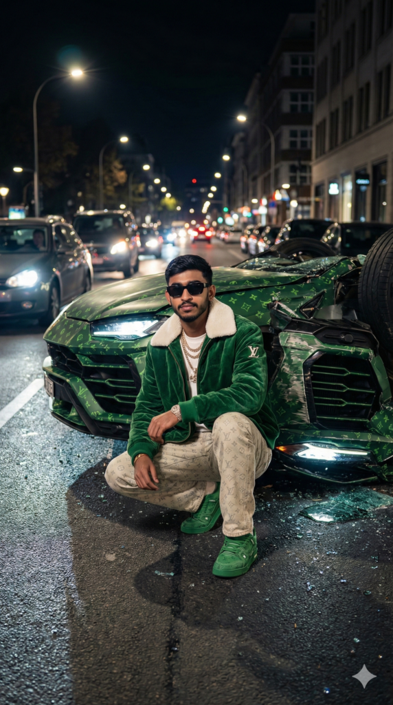 Copy This Prompt: Ultra-realistic cinematic night photography on a busy modern city street. A luxury green Lamborghini Urus wrapped in Louis Vuitton monogram lies overturned in the background. The subject, an adult man with the EXACT SAME FACE as the uploaded reference, crouches confidently beside the overturned SUV. He wears black sunglasses, a green velvet Louis Vuitton jacket, and layered gold chains. Relaxed posture, subtle confident smile. Cinematic lighting: cool streetlight tones mixed with warm headlight highlights. Soft rim lighting outlining the man and vehicle. Shot on a full-frame camera, shallow depth of field, hyper-detailed textures. Aspect Ratio STRICTLY 9:16 Vertical.