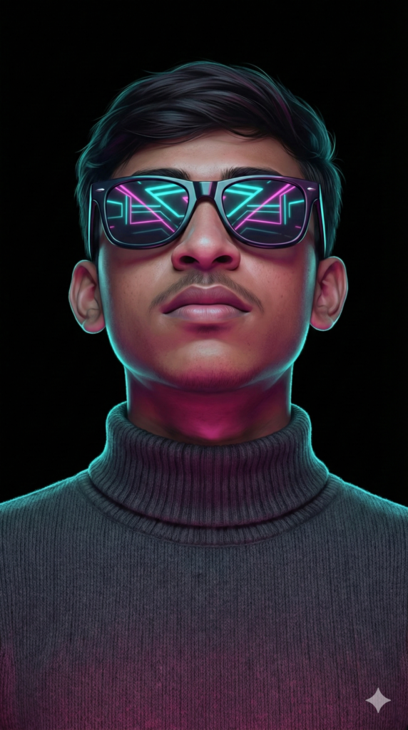 Copy This Prompt: A cinematic close-up low-angle portrait of a handsome masculine figure wearing a fitted ribbed turtleneck sweater and sleek retro-futuristic dark sunglasses. The face should match the uploaded reference image accurately. The lighting features vibrant neon tones with soft magenta and pink underlighting casting subtle shadows. A gentle cyan and blue rim light outlines the jawline and hair, separating the subject from a deep black background. The sunglasses reflect abstract neon geometric patterns in cyan and pink. Rendered in a clean, modern digital illustration style with realistic skin texture. Aspect Ratio Strictly 9:16 Vertical.