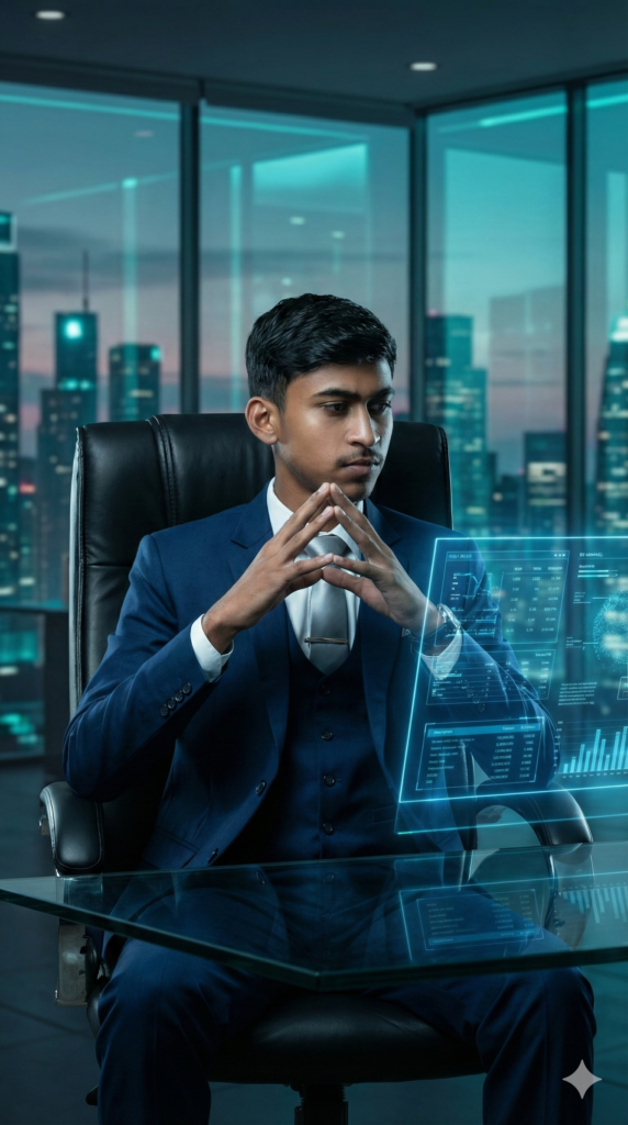 Copy This Prompt: Ultra-realistic 8K cinematic portrait of a handsome young man, face 100% same as the reference image provided. He is sitting in a modern, high-back leather chair in a dimly lit, high-tech penthouse office overlooking a futuristic skyline at twilight. Posture is dominant and intellectual. He wears a bespoke midnight-blue three-piece suit with a metallic silver tie. The background features floor-to-ceiling windows revealing a sprawling city grid of lights. Lighting: Soft, cool studio lighting with rim lighting. Mood: Visionary, commanding, ultra-masculine. Aspect Ratio Strictly 9:16 Vertical.