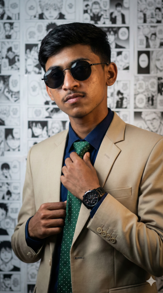 Copy This Prompt: A cinematic fashion portrait of a confident young man standing against a wall fully covered with black-and-white manga comic panels. The face must be 100% identical to the uploaded reference image-exact same facial features. He wears a tailored beige suit jacket over a deep navy blue dress shirt, paired with a green tie featuring subtle yellow polka dots. He is adjusting his tie with one hand, showcasing a luxury black wristwatch. Round black sunglasses, mysterious composed expression, neatly slicked-back hair. Dramatic studio lighting with soft shadows and high contrast, ultra-detailed skin texture, sharp focus, editorial fashion photography style, 8K resolution. Aspect Ratio 9:16.