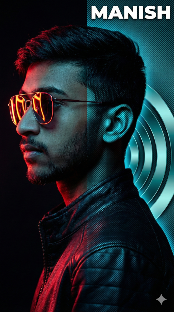 Copy This Prompt: A hyper-detailed cyberpunk portrait of a stylish young man in side profile, facing left. He has the same Hairstyle and beard. Dramatic cinematic lighting with strong red rim light on the left side and teal-blue lighting on the right side. The composition is vertically split down the center—the left half shows a clean, sharp portrait, while the right half blends into a textured halftone dot pattern effect that merges with the teal geometric background. Typography space at the top right for bold white title text (“MANISH”). Ultra HD, 8K resolution, cinematic color grading, sharp focus, vibrant neon lighting, cyberpunk aesthetic. Aspect Ratio Strictly 9:16 Vertical.