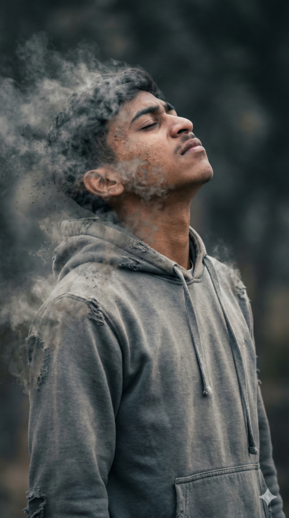 Copy This Prompt: A raw, emotional 8K portrait (9:16) of [A young man matching reference image characteristics]. Head tilted back, eyes closed, expression of release and pain. He wears a faded, textured grey cotton hoodie. The soft fabric of the hood and shoulders is fraying and dissolving into thick clouds of softer grey smoke and dust, mixing organically with his disintegrating skin. His hair lifts, turning into vapor. Natural, somber lighting, emphasizing the texture of the dying fabric and skin.
