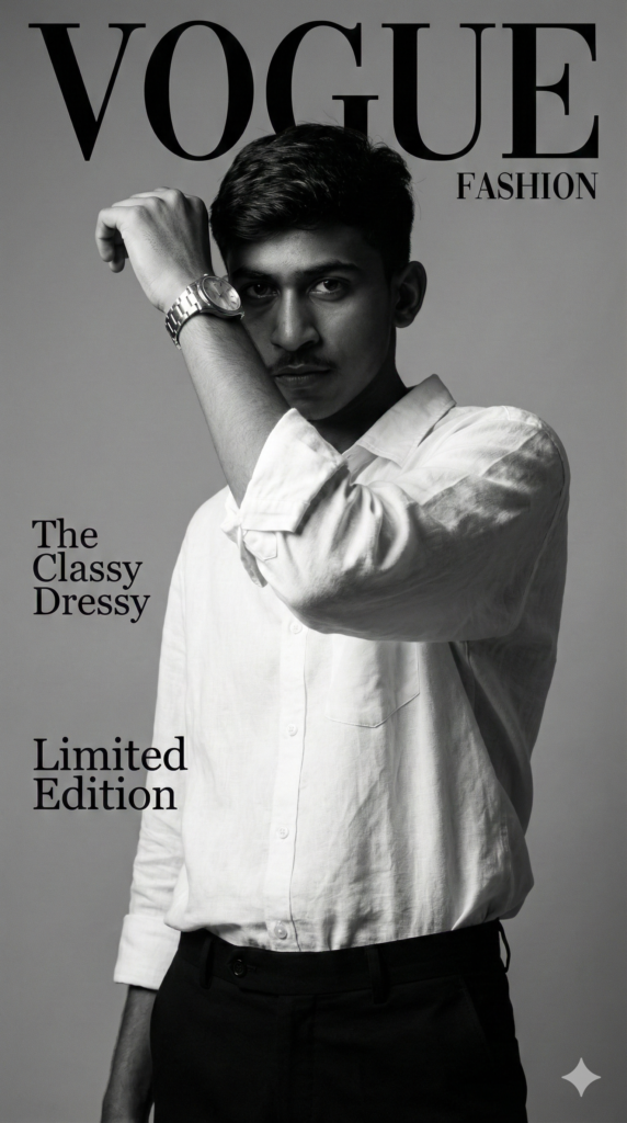 Copy This Prompt: Ultra-luxury black-and-white Vogue fashion editorial cover featuring a confident young man with same hairstyle and same eyes. He wears an oversized white linen shirt with naturally rolled sleeves and tailored black trousers. One arm is raised elegantly, partially shielding his face in a mysterious pose, revealing a sleek metallic wristwatch. Shot against a minimalist matte gray studio backdrop with soft yet dramatic directional lighting. Clean, bold “VOGUE” masthead at the top, modern editorial typography with “FASHION” headline. High-end fashion photography, luxury editorial aesthetic, timeless monochrome, sharp focus, studio masterpiece. Aspect Ratio Strictly 9:16 Vertical.