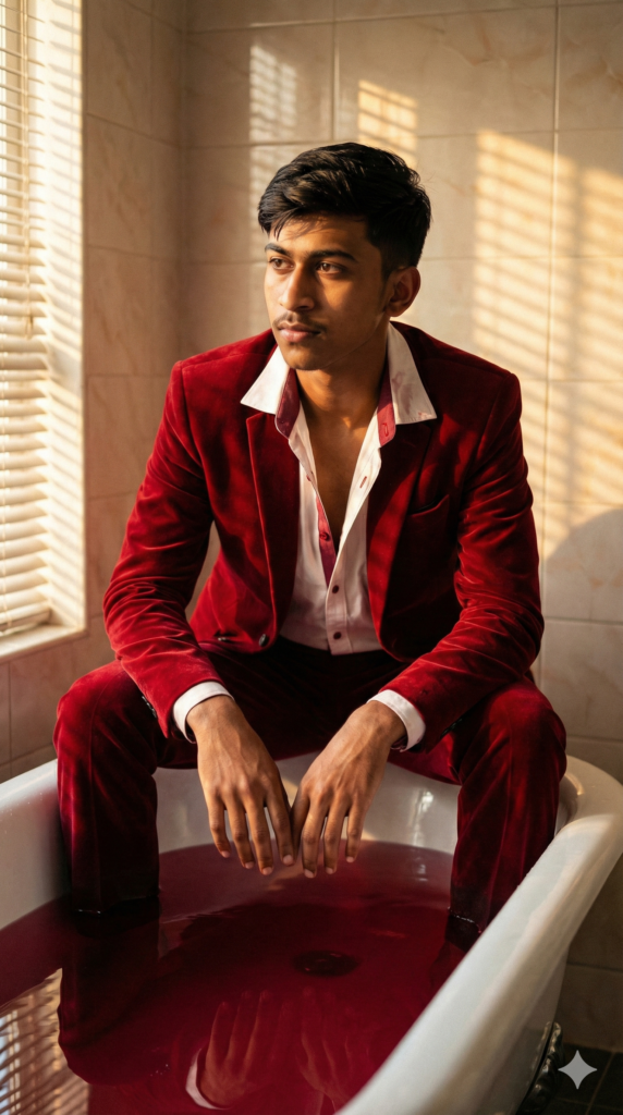Copy This Prompt: Ultra-realistic 8K cinematic portrait of a handsome young man, face 100% same as the reference image provided. He is sitting confidently on the edge of a white bathtub filled with deep crimson-tinted water. Soft golden sunlight streams through window blinds. He wears a deep red velvet suit jacket over a half-open white shirt with subtle crimson accents. The shirt collar is slightly wet. The background shows soft reflections of light on tiles and water. Retro film-style color grading, slight grain, high contrast. Mood: bold, masculine, elegant. Aspect Ratio Strictly 9:16 Vertical.