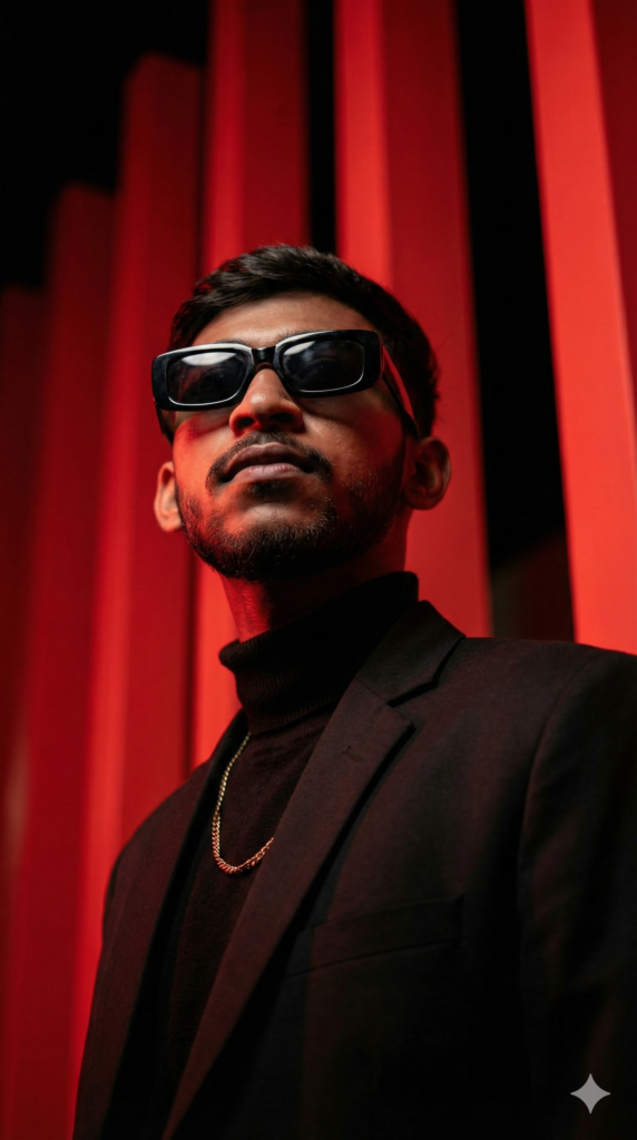 Copy This Prompt: A striking, ultra-realistic portrait of a confident man with same hair and a same beard, dressed in a sleek black turtleneck layered under a tailored black blazer. A subtle gold chain rests against the fabric. He wears bold, thick-framed sunglasses that enhance his mysterious aura. The scene is drenched in intense, high-contrast red lighting, casting dramatic shadows across his strong jawline. Shot from a powerful low-angle perspective. Behind him, tall vertical red architectural structures rise into darkness. Hyper-detailed skin texture, sharp contrast, dramatic rim lighting, editorial fashion photography style, 8K resolution. Aspect Ratio Strictly 9:16 Vertical.