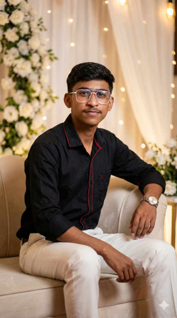 Prompt: Ultra-realistic, hyper-detailed, 8K cinematic portrait of a young stylish man, using the uploaded image for exact face and hairstyle. A young man wearing a black shirt with red piping on the collar and rolled-up sleeves, paired with white pants, sitting casually on a sofa chair, white metal frame glasses, a watch on his wrist, and a relaxed yet confident posture. The background features soft, dreamy bokeh with white floral decorations and warm glowing string lights, creating a cozy, elegant, and cinematic atmosphere. Aspect Ratio Strictly 9:16 Vertical