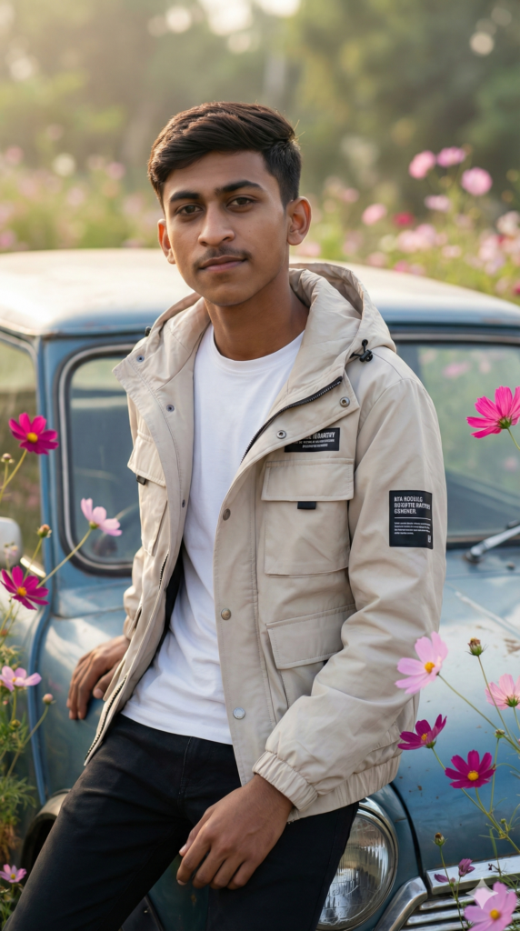 Prompt: Ultra-realistic, hyper-detailed, 8K cinematic portrait of a young stylish man, using the uploaded image for exact face and hairstyle. A young man sitting front-sideways on an old faded-blue Mini Cooper, one hand resting casually behind him on the hood, head turned slightly toward the camera with a subtle confident gaze, wearing a stylish light-beige hooded windbreaker layered over a plain white T-shirt, featuring multiple front pockets, zippers, snap buttons, and black printed patches on the chest and sleeve. Wildflowers in magenta and blush pink bloom around him, with some petals catching focus near the frame’s edges. Background softly melts into pastel greenery with dappled sunlight, creating cinematic glow and depth, captured in editorial lighting with fine detail, high contrast realism, and a professional magazine aesthetic. Aspect Ratio Strictly 9:16 Vertical.