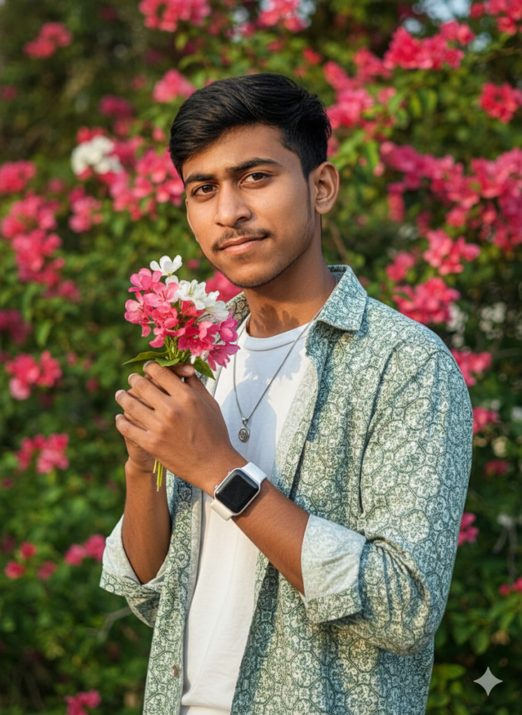 Prompt: Ultra-realistic, hyper-detailed, 8K cinematic portrait of a young stylish man, using the uploaded image for exact face and hairstyle. A young man wearing a green and white shirt layered over a white T-shirt, accessorized with a silver locket and a white Apple smartwatch with reflective metallic edges on his wrist. He holds flowers near his face with a natural, gentle expression, half body waist-up pose. The shirt displays realistic fabric folds and textures. The background features lush green leaves and vibrant pink flowers, enhanced with additional blooming to create a rich, colorful, cinematic setting. Aspect Ratio Strictly 9:16 Vertical