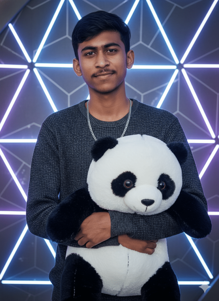 Prompt: Ultra-realistic, hyper-detailed, 8K cinematic portrait of a young stylish man, using the uploaded image for exact face and hairstyle. A young man wearing a dark textured sweater and a sleek silver necklace, standing confidently against a futuristic geometric-patterned wall. He holds a large plush panda toy with ultra-soft white fur and deep black accents. The background features intersecting triangular and polygonal lines glowing with neon blue and gradient violet lighting, creating a modern, immersive atmosphere. The lighting casts soft reflections and ambient glows on the subject’s face and clothing, enhancing textures, while the panda’s contours and plush surface are rendered in lifelike detail, including visible stitching. Aspect Ratio Strictly 9:16 Vertical