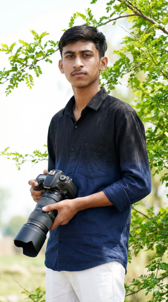 Prompt: Ultra-realistic, hyper-detailed, 8K cinematic portrait of a young stylish man, using the uploaded image for exact face and hairstyle. A young man wearing a loose black and navy blue gradient half-lining shirt and white pants. He holds a wildlife photography camera, standing and looking thoughtfully at the camera in a candid, high-key cinematic outdoor portrait. The background is framed by a branch of vivid foliage. Face exactly as in the reference image, with white skin tone and no smile. Aspect Ratio Strictly 9:16 Vertical