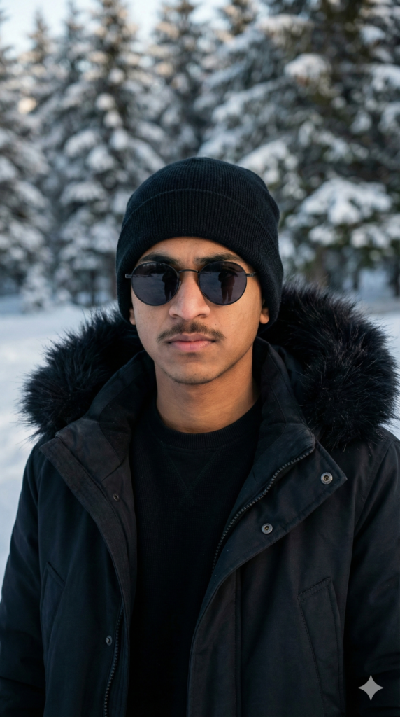 Prompt: Recreate the exact same person from the uploaded reference image, preserving 100% of the original facial structure, age, beard shape, skin tone, hair fully covered by the beanie, and all defining facial features exactly as they appear with no changes. Generate an ultra-realistic cinematic winter portrait matching the same composition, lighting, depth of field, and color grading as the reference. Subject & expression: same person and age, serious calm confident expression with no smile, head facing the camera with a very slight natural tilt, looking straight toward the camera through sunglasses. Outfit & styling: black thick winter parka with a large dark fur-lined hood surrounding the neck, black knit beanie fully covering the head, black round sunglasses with thin metal frame and dark lenses, black inner sweater with a clean minimal look; all fabrics realistic, high-quality, and winter-appropriate. Pose & framing: medium close-up. Aspect Ratio Strictly 9:16 Vertical