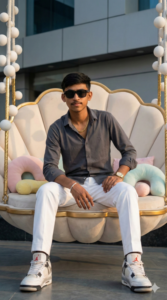 Prompt: Use the uploaded reference photo as the ONLY identity source. STRICT IDENTITY LOCK: Keep the face EXACTLY the same as the uploaded image. Ultra-realistic, hyper-detailed, 8K cinematic portrait of a young stylish man. A young man wearing a soft dark gray shirt, white pants, and Air Luxury Jordan shoes, sitting gracefully on a shell-shaped swing decorated with white balls and gold accents. He wears black sunglasses, a slim silver bracelet, a slightly thick gold chain, and a gold wristwatch. Pastel macaroni pillows surround him, with a modern building in the background. The man sits comfortably in a luxurious, stylish pose, with ultra-detailed textures and cinematic lighting enhancing the elegance and sophistication. Aspect Ratio Strictly 9:16 Vertical
