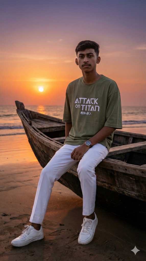 Prompt: Ultra-realistic, hyper-detailed, 8K cinematic portrait of a young stylish man, using the uploaded image for exact face and hairstyle. A young man wearing an oversized olive shirt with an Attack on Titan logo print, white formal trousers, sneakers, and a watch, sitting on an old boat stranded on the beach. He has a modern hairstyle and is looking directly at the camera at sunset during late night. The face is 100% identical to the reference image, with no changes. Aspect Ratio Strictly 9:16 Vertical