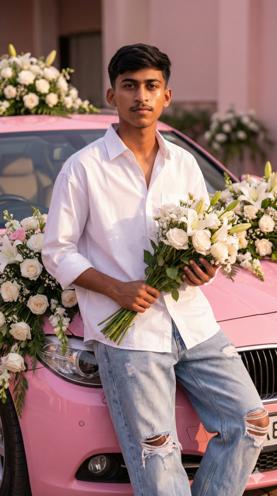 Prompt: Ultra-realistic, hyper-detailed, 8K cinematic portrait of a young stylish man, using the uploaded image for exact face and hairstyle. A young man wearing an oversized white shirt and ripped light-wash baggy jeans, holding a white flower bouquet and leaning casually on a glossy pink car decorated with flowers under bright daylight. Same hairstyle and matching beard style frame his face with a soft pink glow, exuding a candid, effortlessly cool vibe. Warm cinematic lighting highlights flawless, glowing skin and ultra-realistic textures of the fabric, flowers, and car, creating a high-fashion, photorealistic outdoor portrait. Aspect Ratio Strictly 9:16 Vertical