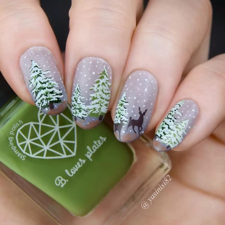 These nails tell a winter story. Trees, deer, and snowflakes bring a forest scene to life. It feels calm, magical, and peaceful.