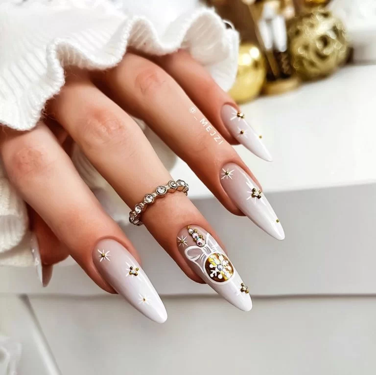 This design is all about shine. Silver glitter and white snowflakes feel very wintery and calm. It looks like fresh snow under bright lights.