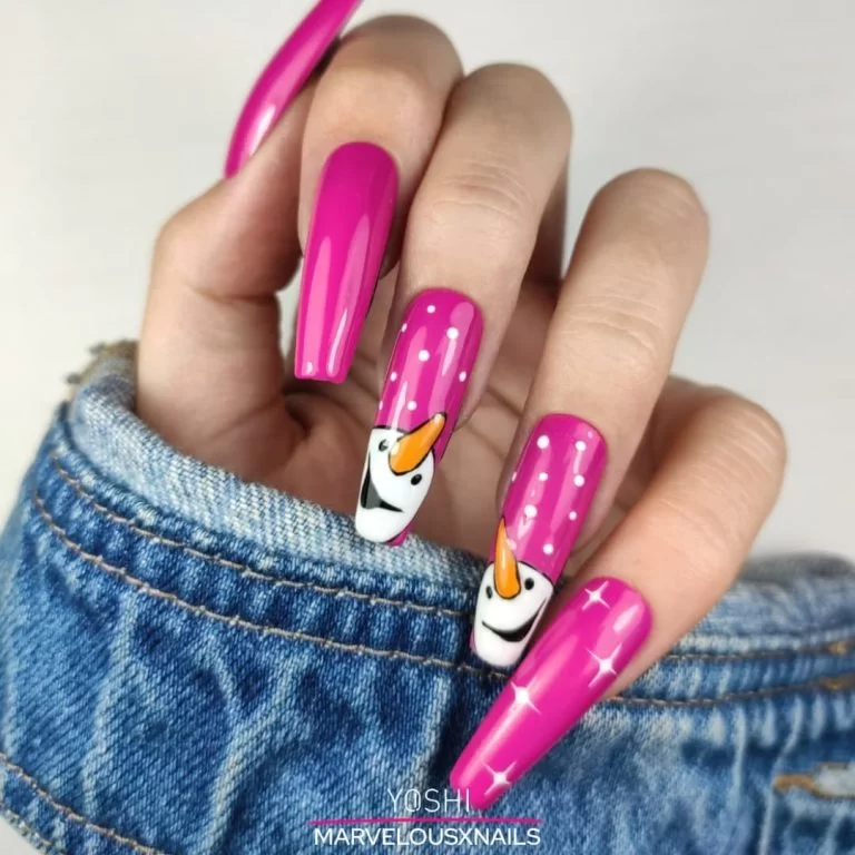 Yes, pink works in winter too. Bright pink nails look bold and fun. Cute snowmen and snow dots turn it into a winter story.