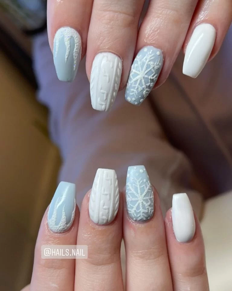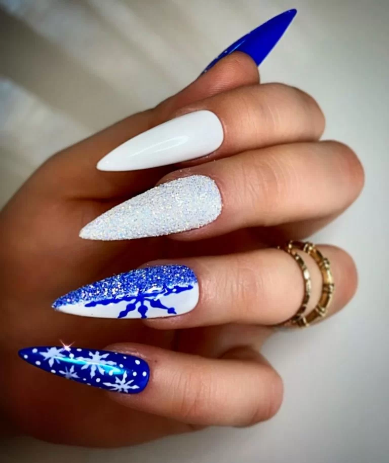 White nails with a pop of bright blue stand out nicely. The colors feel like old glass ornaments. A touch of white glitter adds shine.