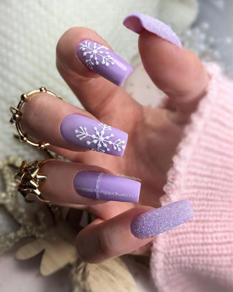 Purple is becoming a winter favorite. Cool purple shades feel calm and frosty. Snowflakes, glitter, and plaid details make this look complete.