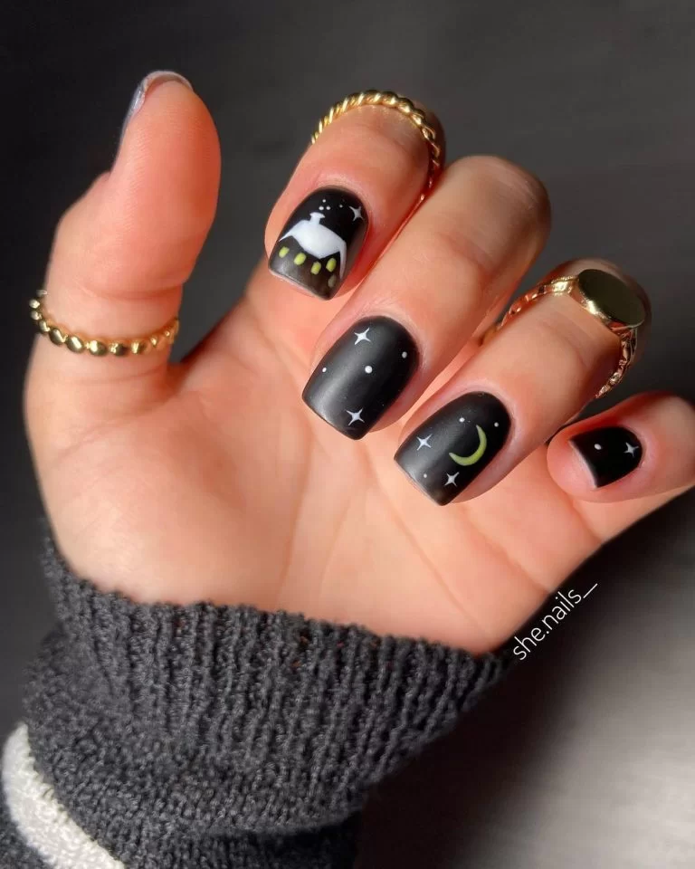 These nails feel calm and dreamy. Matte black polish with stars, a moon, and a house looks peaceful. It feels festive without being loud.