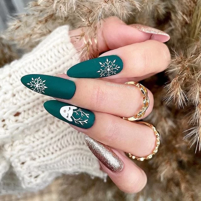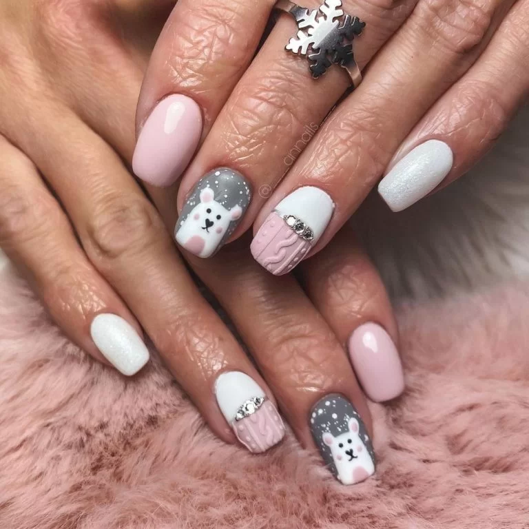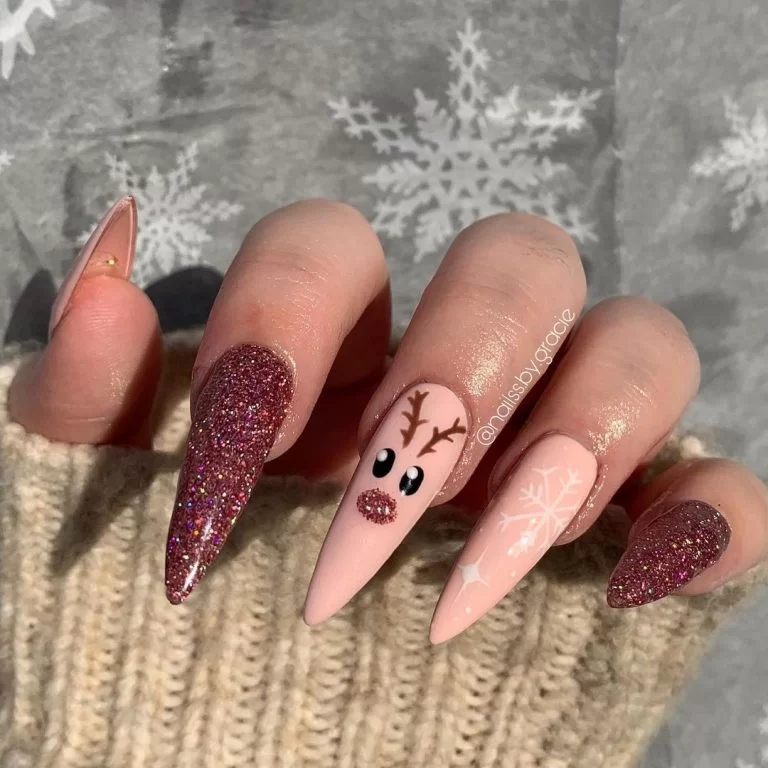 These nails feel playful and cute. A small reindeer face adds a Christmas nod without being too bold. The colors work together in a soft and pretty way.