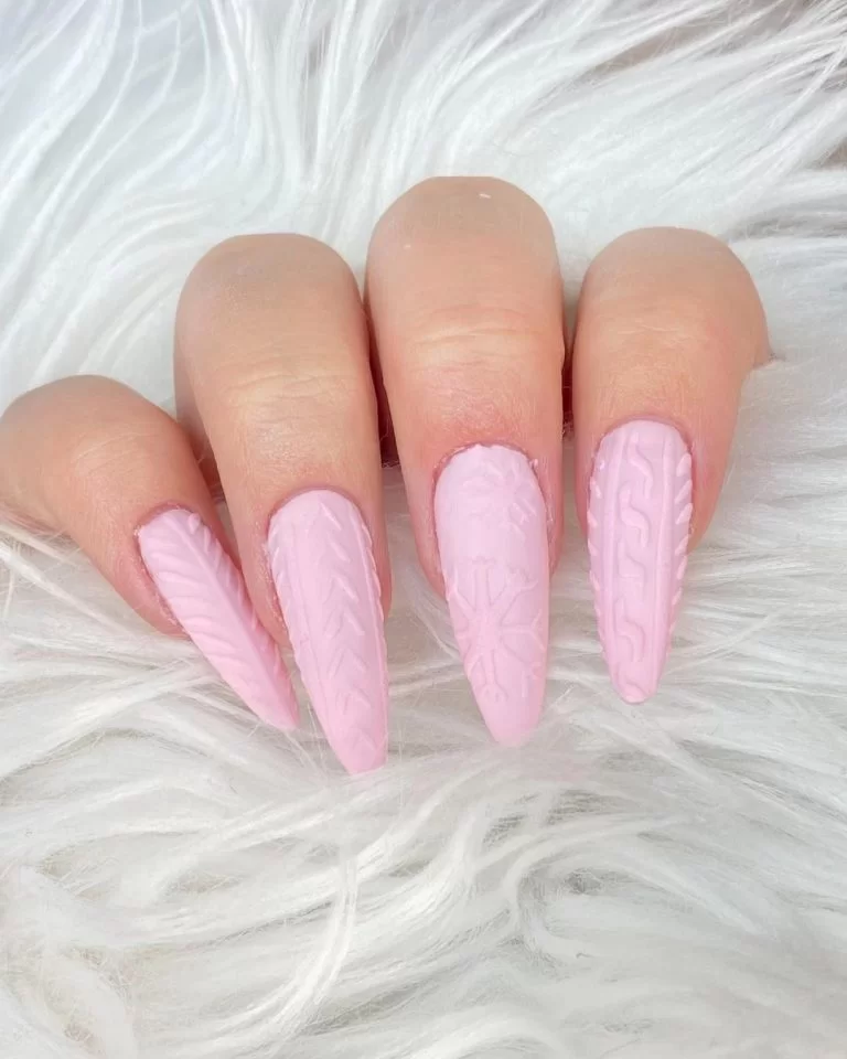 Soft pink nails look sweet and gentle in winter. The sweater texture gives a cozy knit feel, like your favorite winter sweater. The 3D look adds charm and depth.